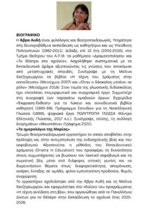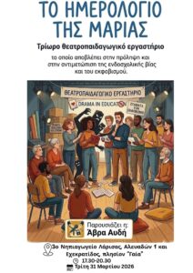 Ο Σύλλογος ETAL Εκπαιδευτικών Αγγλικής Γλώσσας και Φιλολογίας Ν. Λάρισας διοργανώνει τρίωρο θεατροπαιδαγωγικό εργαστήριο με τίτλο «Το Ημερολόγιο της Μαρίας» και την καθοδήγηση της Άβρας Αυδή, φιλόλογου και θεατρο-παιδαγωγού. Το εργαστήριο απευθύνεται σε εκπαιδευτικούς όλων των βαθμίδων και αποβλέπει στην πρόληψη και αντιμετώπιση της ενδοσχολικής βίας και του εκφοβισμού.
